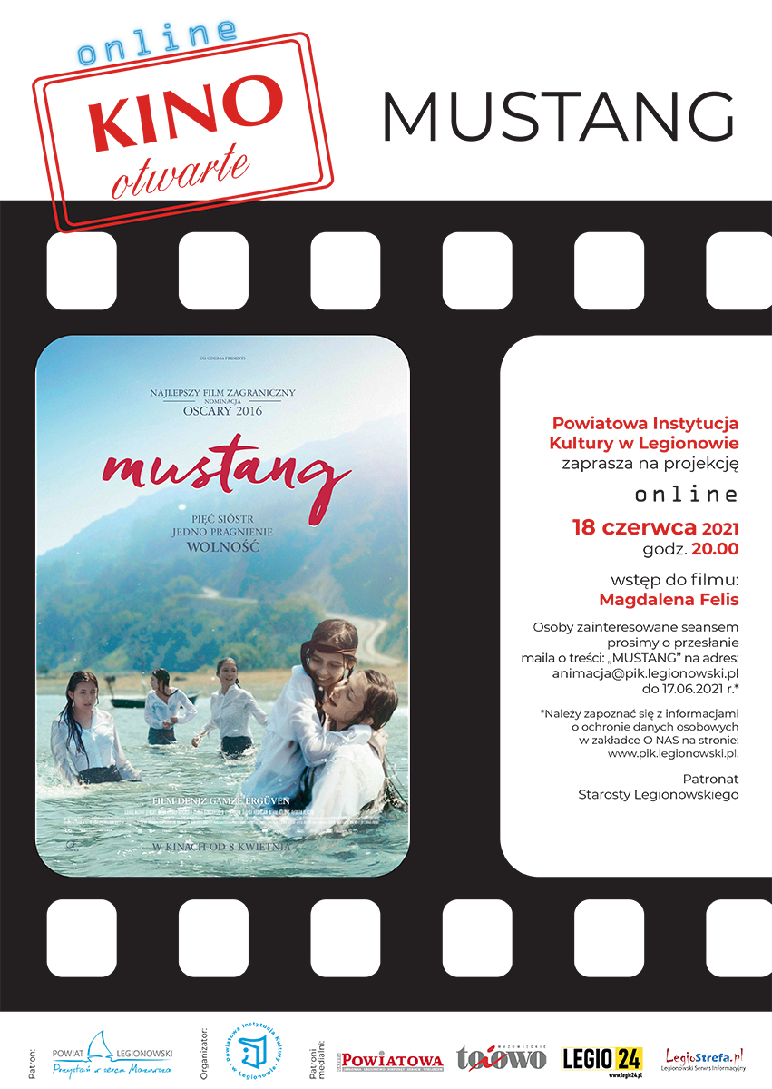 Osoby zainteresowane obejrzeniem filmu prosimy o przesłanie maila o treści: „MUSTANG” na adres: animacja@pik.legionowski.pl do 17.06.2021 r. Seans jest bezpłatny, jednak liczba widzów ograniczona. (Przed wysłaniem maila należy zapoznać się z informacjami o ochronie danych osobowych w zakładce O NAS: https://pik.legionowski.pl/m-onas/m-pik/informacja-rodo.html).